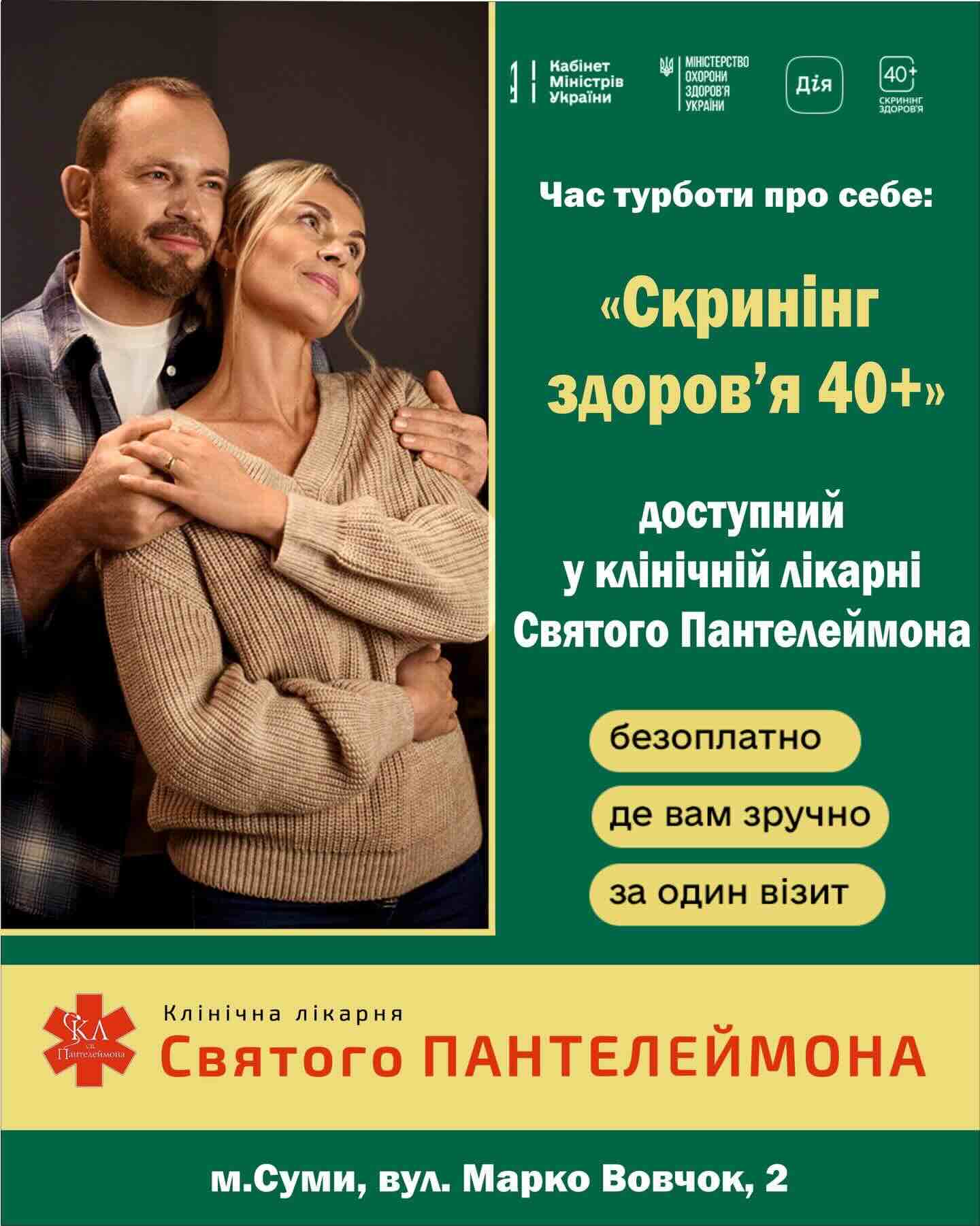 Клінічна лікарня Святого Пантелеймона у Сумах продовжує розширювати спектр доступних медичних послуг для населення. Під керівництвом директора Володимира Поцелуєва заклад долучився до важливої національної програми «Скринінг здоров’я 40+». Відтепер сумчани віком від 40 років можуть пройти комплексне безоплатне обстеження.